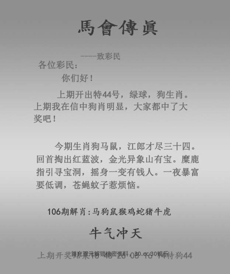 今期生肖狗马鼠,江郎才尽三十四。回首掏出红蓝波,金光异象山有宝。糜鹿指引寻宝洞,摇身一变有钱人。一夜暴富要低调,苍蝇蚊子惹烦恼。